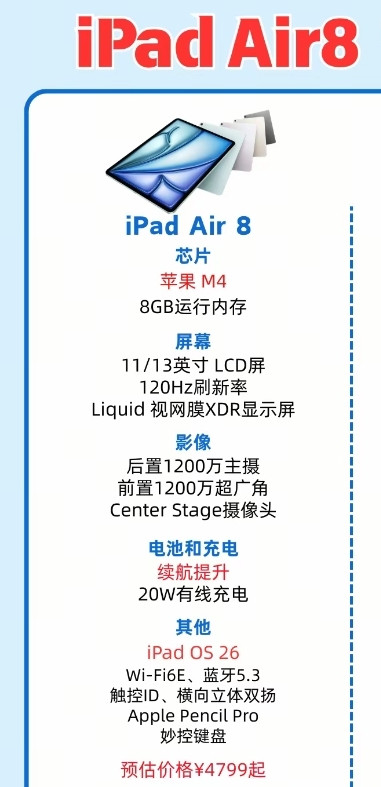 3:续航方面iPad Air 8内置大容量电板,协作M4芯片的高能效比,是非提供抓久的使用时候。充电方面支撑20W有线充电,餍足日常快速补电需求。系统方面iPad Air 8预装iPad OS 26,带来更智能、更高效的交互体验。新系统支撑Apple Pencil Pro和妙控键盘,进一步拓展了iPad Air 8的分娩力运用场景。此外iPad Air 8还支撑Wi-Fi 6E和蓝牙5.3,畅通速率更快,踏实性更高。