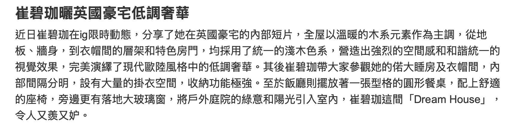 现年37岁的香港女星崔碧珈近几个月来新闻不断,先是与TVB艺东谈主郑健乐一段似黑白是的恋情闹得沸沸扬扬。这才平息不久,又被曝光在香港购买的豪宅,因为其莫得按照条约付清余款,而且片面向诱导商交还了钥匙,卖方还因此而断绝条约,充公了其订金,更是入禀香港高院,向其催讨占用费以及收复费共计376万元。而崔碧珈对此莫得回话,早前还在英国买了豪宅,还在应付平台上大晒豪宅。