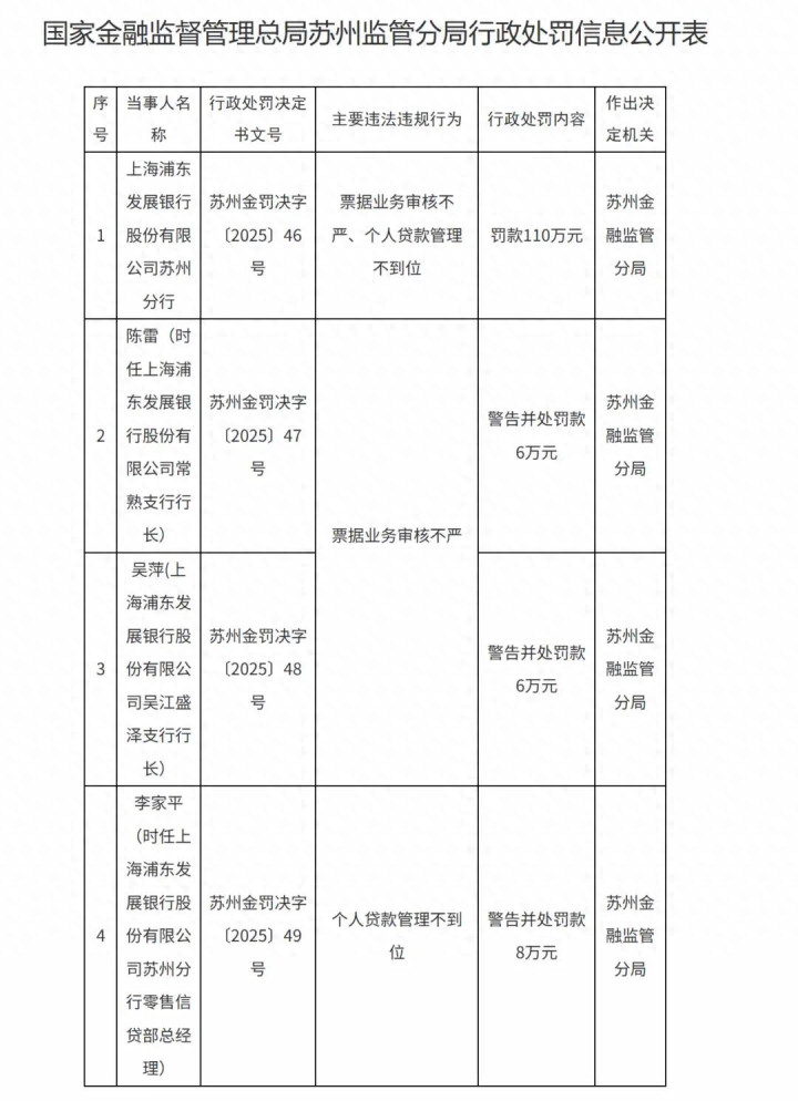 近日,国度金融监督护士总局苏州监管分局行政处罚信息公开表显现,因单子业务审核不严、个东说念主贷款护士不到位,上海浦东发展银行股份有限公司(下称“浦发银行”)苏州分行及联系崇拜东说念主被行政处罚。
