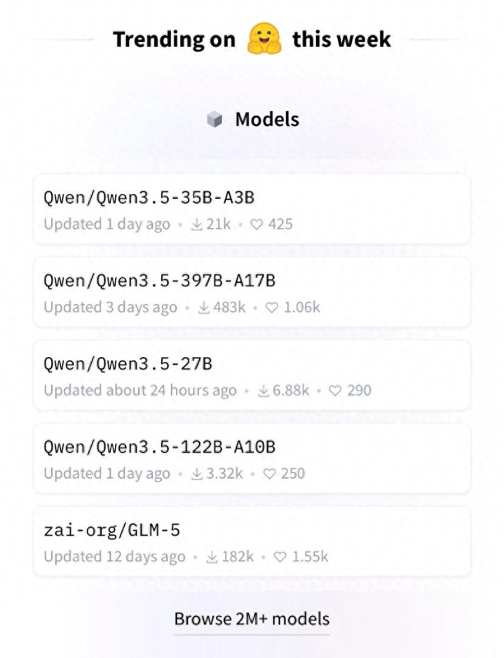 2月26日,各人最大 AI 开源社区Hugging Face公布新一期开源大模子榜单,阿里千问3.5模子包揽前四,成为各人AI社区最热点的开源模子。据了解,新上榜的三款中型千问3.5模子,在多个榜单发达均清爽优于GPT-5 mini,且原生多模态才气和Agent才气强悍,性能刷新中等尺寸模子的新高,部分模子以致可凯旋部署在糜费级显卡上,开源不到24小时便收场登顶。在最新一期各人开源模子榜单中,排行前十的均是中国模子或中国模子的生息模子,基于千问大模子的3款生息模子雷同入选前十。