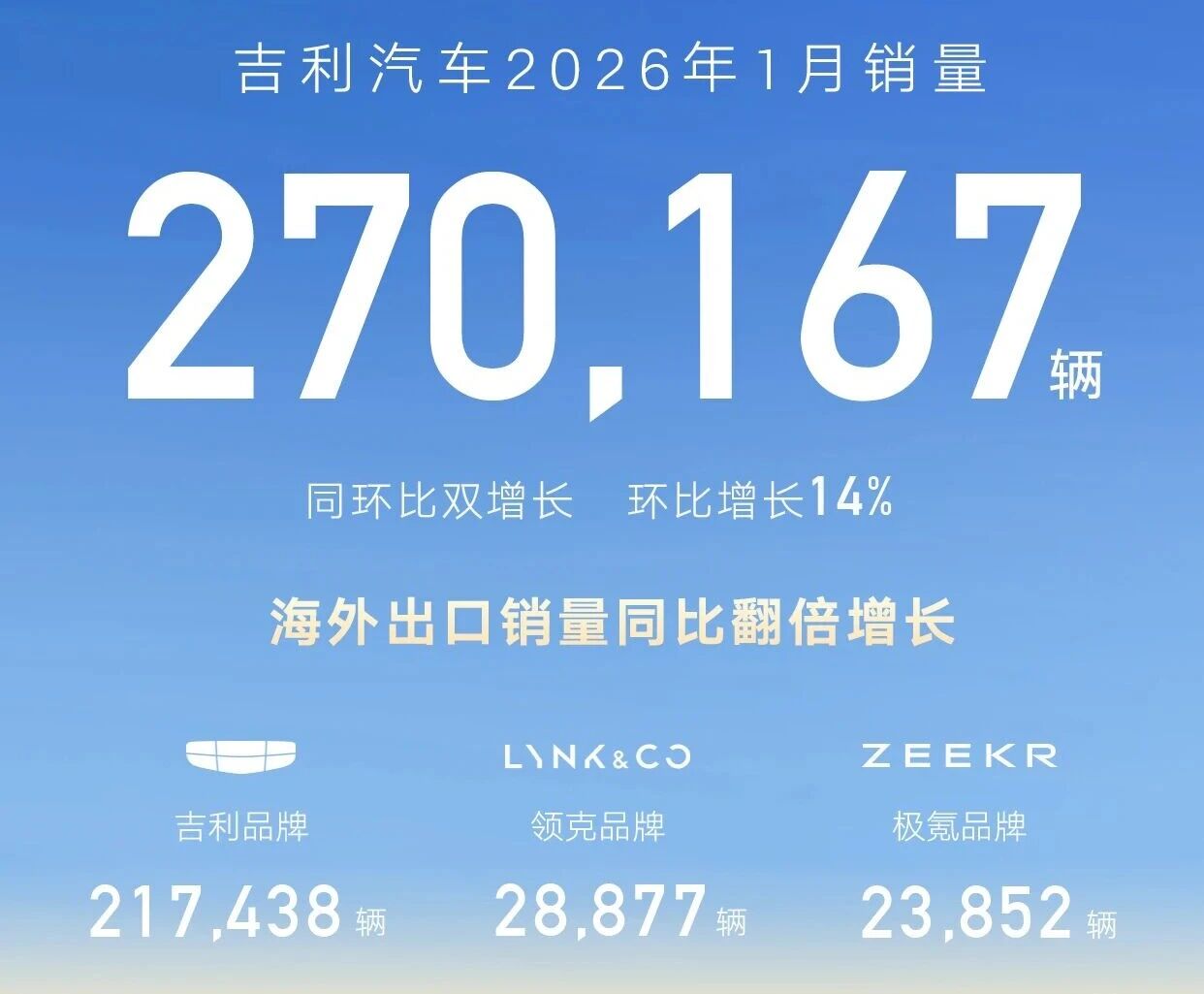 祥瑞稳中有进,总销量27.02万辆,同比增长1%,环比增长14%,以少有的同环比双增长恰当高出比亚迪。其中极氪委派2.38万辆,同比近乎翻倍;出口6.05万辆,同比翻倍。