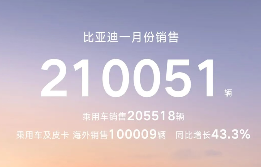 传统车企方面,比亚迪新动力霸主地位动摇,1月销量21万辆,同比下滑30.11%,为近两年头度负增长。但其出口阐明亮眼,外洋销量10.05万辆,同比激增51.47%,占全体销量47.8%。