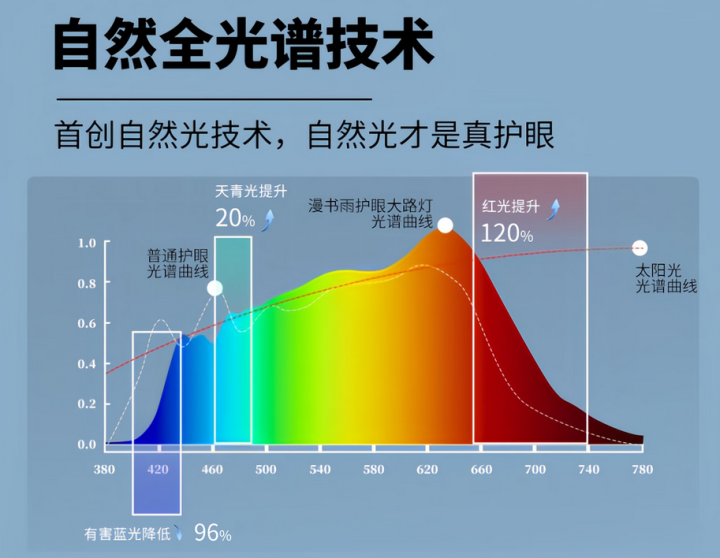 漫书雨星光Pro用的是天然光全光谱工夫。该工夫最大的上风是光谱宽度接近太阳光,遮蔽沿途可见光波段。无益蓝光戒指后果彰着,实测蓝光含量不及RG0均值的5%,进一步保险了居品的防蓝光后果。另外,该光谱工夫还彰着提高了益眼红光和益眼天青光的含量,在增强眼部活 力,匡助睫状肌削弱休息。
